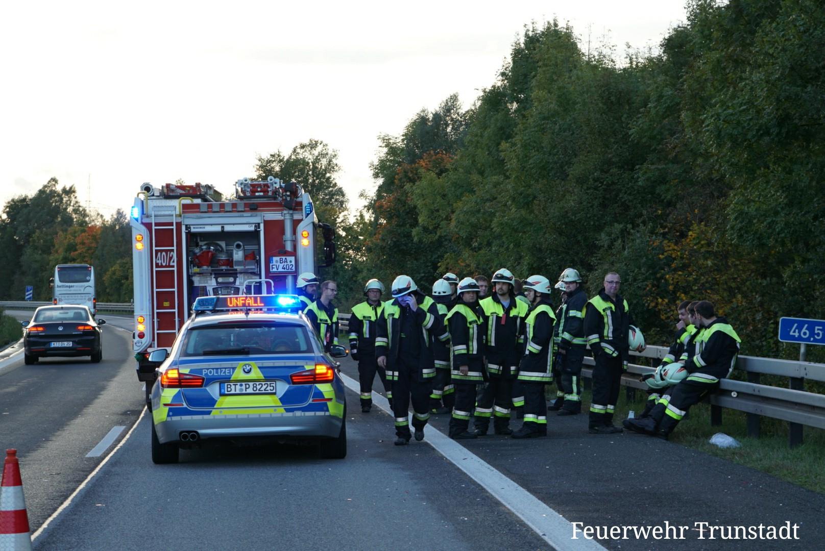 Am heutigen Feiertag dem Tag der Deutschen Einheit wurden wir zusammen mit der Feuerwehr Viereth zu einem Verkehrsunfall auf die Autobahn A70 kurz vor der Ausfahrt Eltmann Alarmiert. Dort war es zu einem Zusammenstoß zwischen einen PKW und Wohnmobil während eines Überholvorgangs gekommen. Wir sicherten zusammen mit der Feuerwehr Viereth die Unfallstelle ab und sperrten den rechten Fahrstreifen sowie den Standstreifen. Glücklicherweise gab es nur eine Leichtverletzte Person.