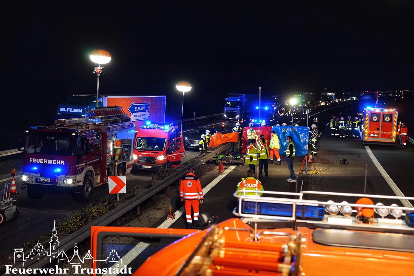 Bei dem Verkehrsunfall war ein Motorradfahrer von der Fahrbahn abgekommen und verstarb leider noch an der Einsatzstelle. Durch die Wucht des Aufpralls lagen Trümmerteile ca. hundert Meter verteilt auf der Autobahn Eltmann Richtung Bamberg.